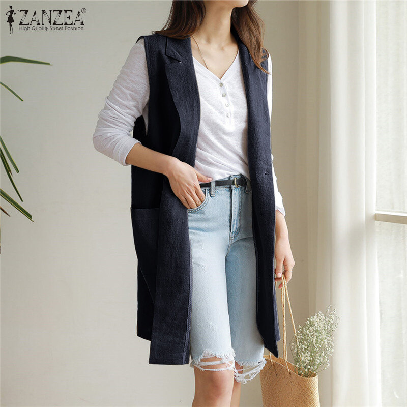 ZANZEA Women Sleeveless Pure Cotton Blazer Suits Plain Basic Button Casual Waistcoat