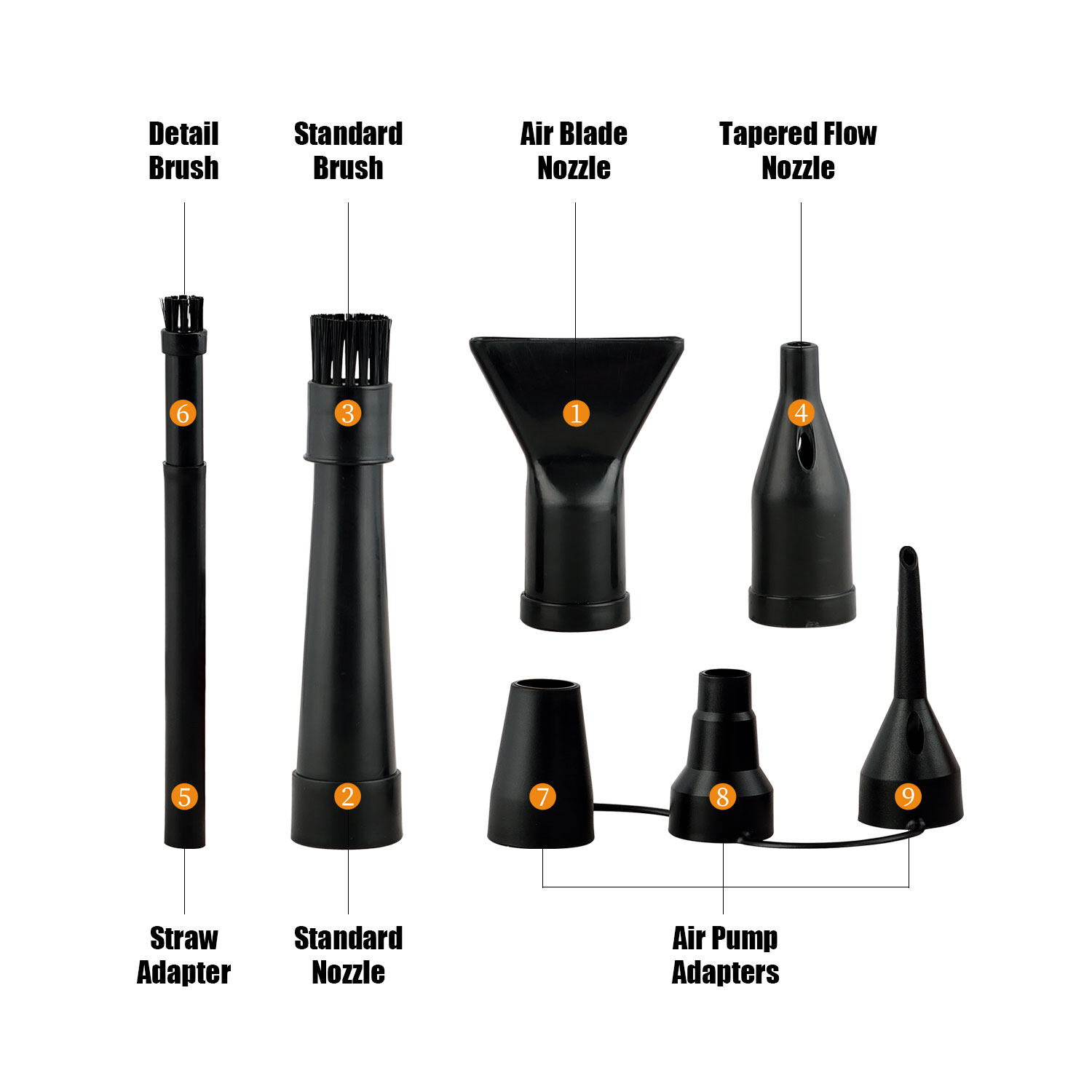 • Multi-Use: an alternative to canned air, the A-2 is more effectively used in computers, laptops, car interiors, cameras, medical equipment, model vehicles, and blinds .Many more other applications with 9 easy-to-use nozzle attachments