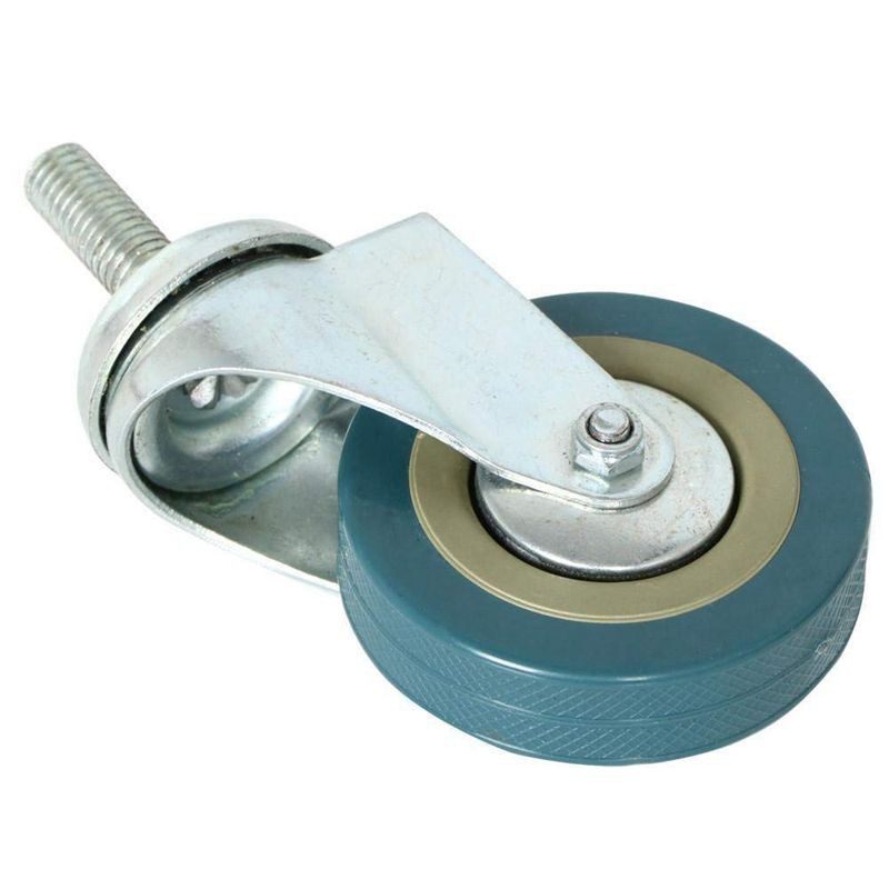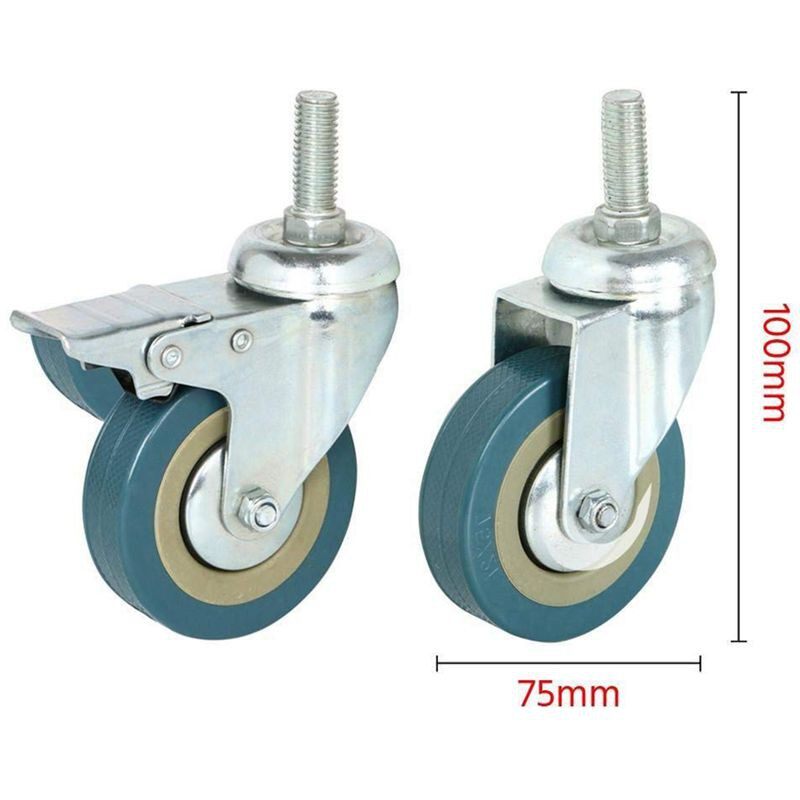 Constructed of heavy duty steel and PVC Double ball bearing swivel head with threaded M 12 screw bolt fixing Swivel castor wheels This is a set of four heavy duty swivel & braked bolt fixing castors with threaded M12 screw bolt fixing and PVC wheels. It is great for various uses ranging from DIY to industrial applications (shops, schools, home and hospitals). Constructed of heavy duty steel and PVC Double ball bearing swivel head With threaded M 12 screw bolt fixing Wheel Type: plain bearing, heavy duty PVC Includes 2 x Swivel Wheels, 2 x Swivel with Brake Wheels Load Rating: 200 Kg/ 440 Lb (50 Kg / 110 Lb each) Great for various uses ranging from DIY to industrial applications (shops, schools, home and hospitals) Color: picture color Material: PVC, metal Caster size: 75mm Thread size: 12*30mm Package Contents: 4 x casters Only the above package content, other products are not included. Note: Light shooting and different displays may cause the color of the item in the picture a little different from the real thing. The measurement allowed error is +/- 1-3cm.