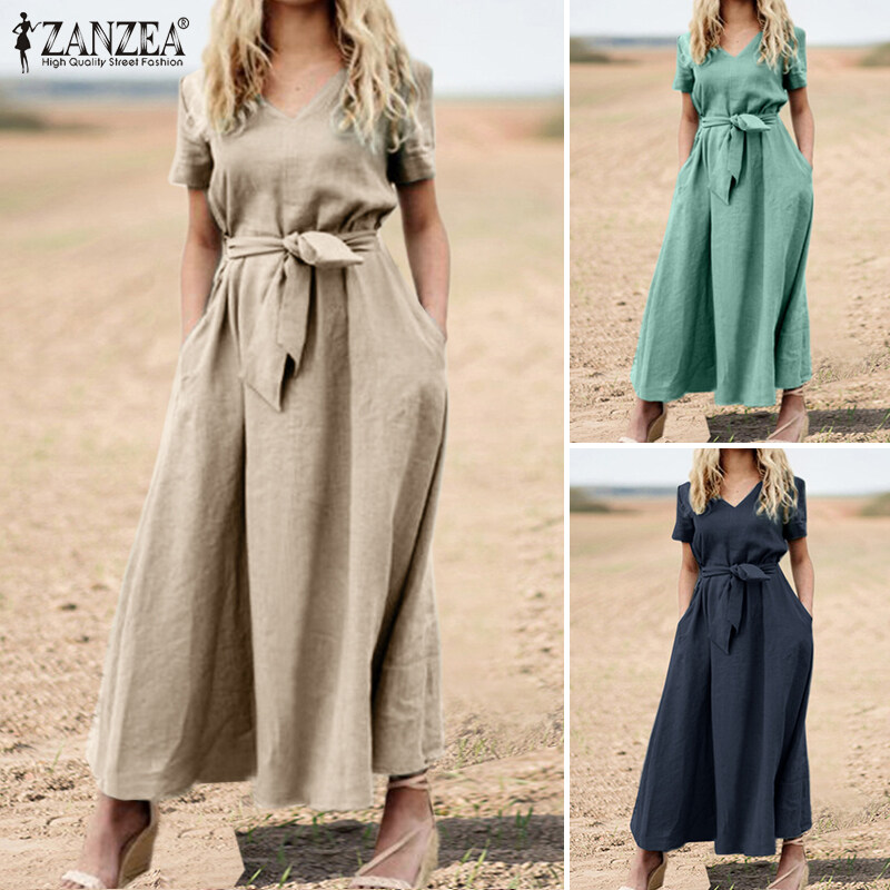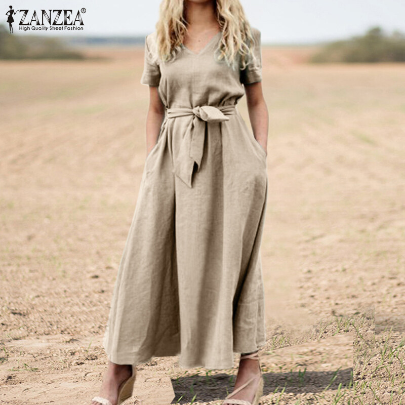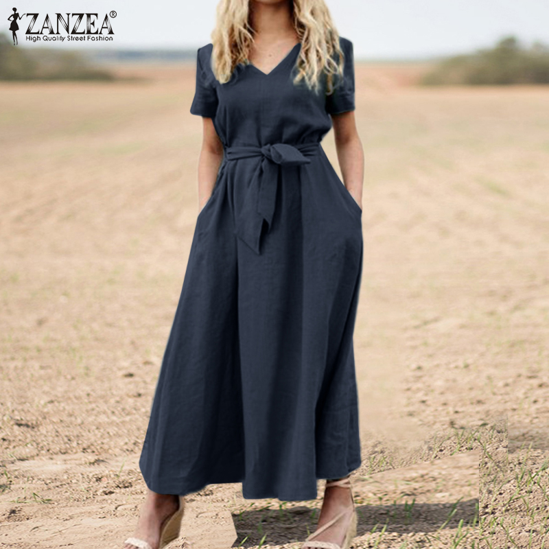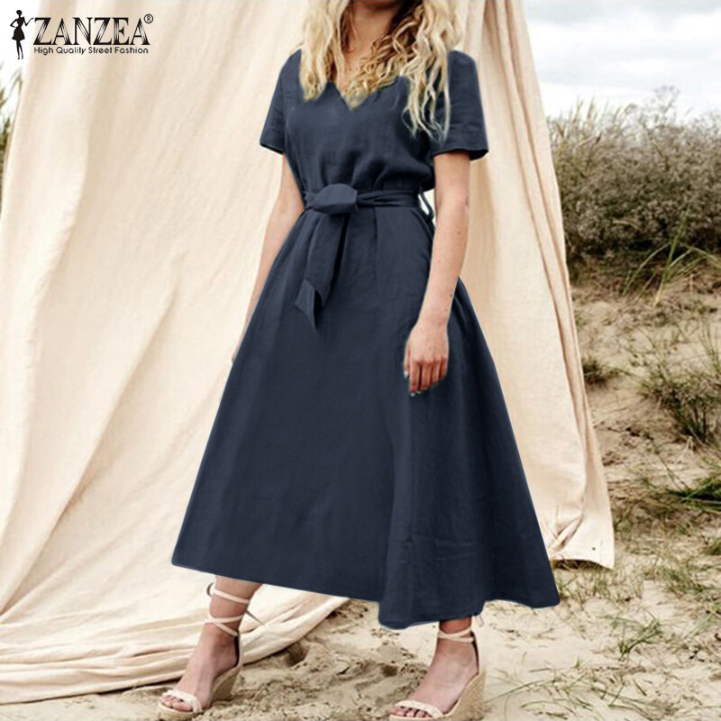 ZANZEA Women Summer Short Sleeve V Neck Belted Cotton Dress Casual Maxi Dresses
