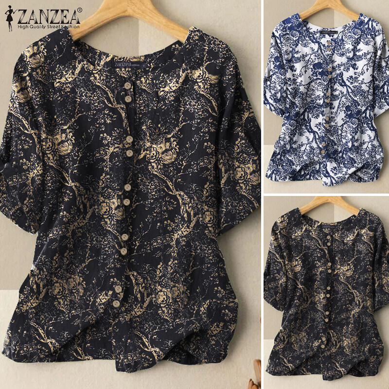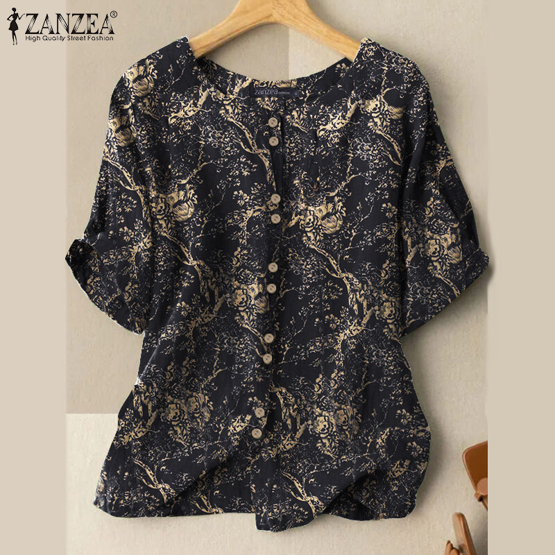 ZANZEA Women Short Sleeve O Neck Cotton Printed Plain Tops Shirts Button Down Blouse #2