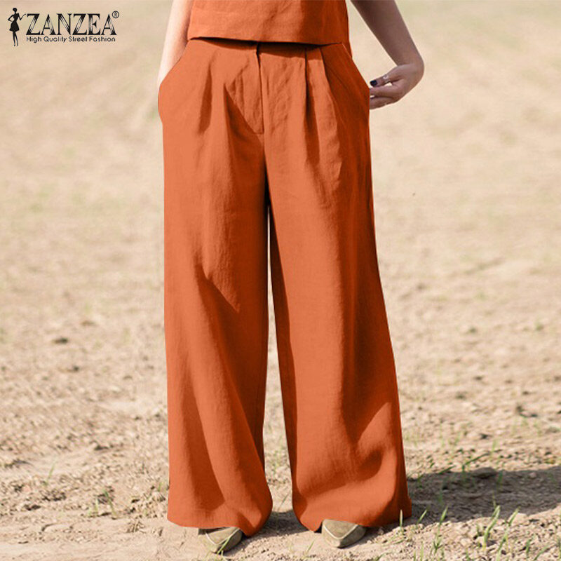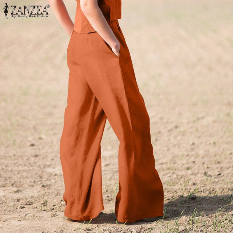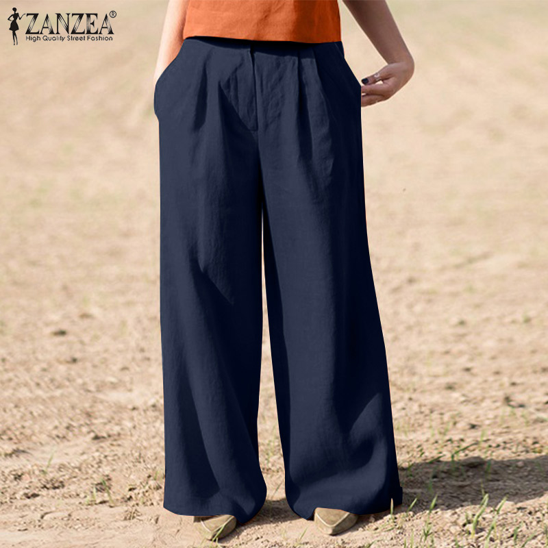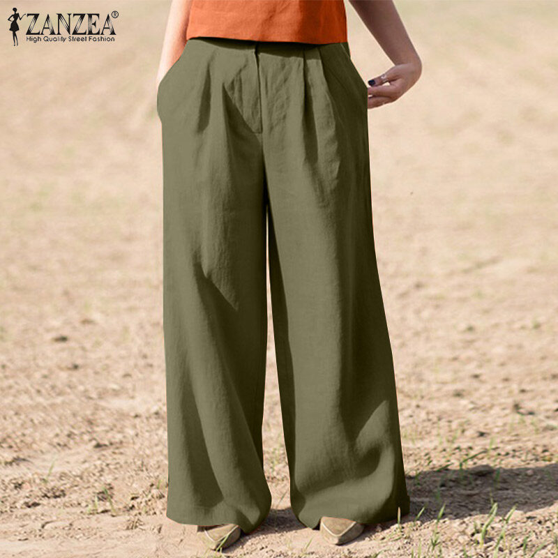 ZANZEA Women Commute Vintage Casual Pants Versatile Cotton Linen Solid Loose Wide Leg Trousers #15