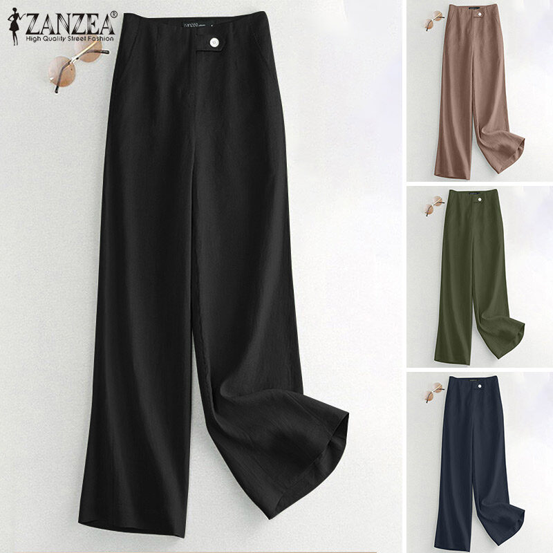 ZANZEA Women Vintage Cotton Side Pockets Trousers Casual Loose Plain Front Zipper Straight Pants #2