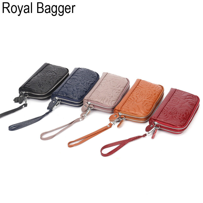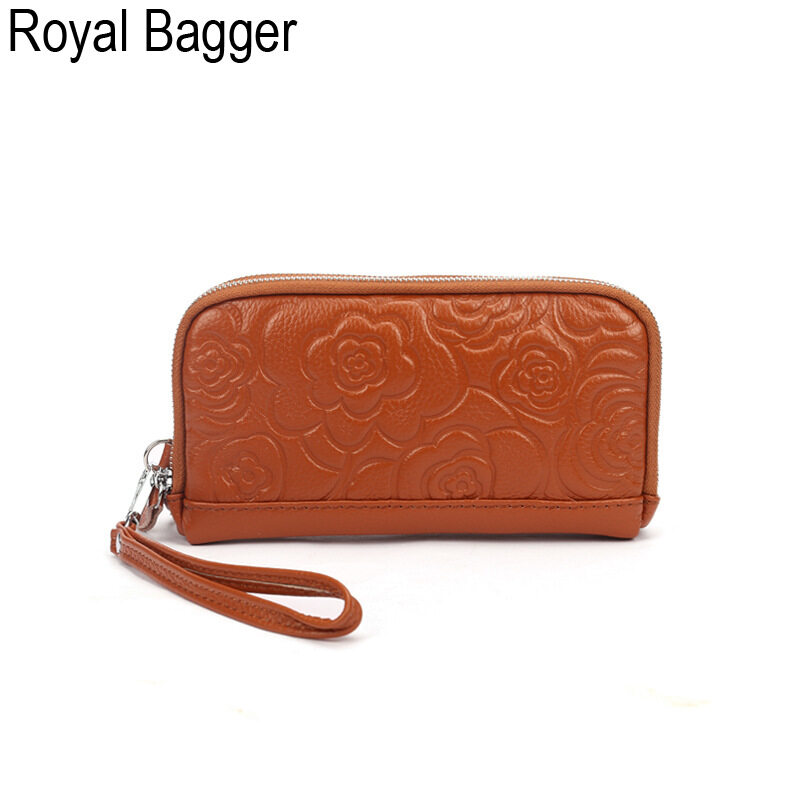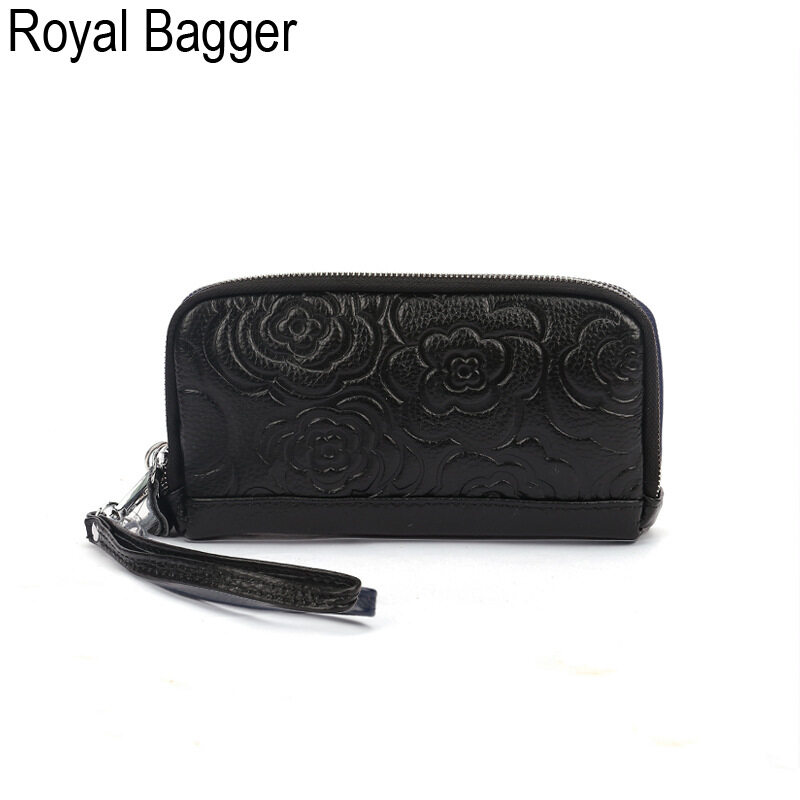 Royal Bagger Genuine Cow Leather New Fashion Double Zipper Flower Long Wallet Purse For Women Girls Super Hot High Capacity Clutch Bag Handbag Women's Multifunction Bags Casual Multi-Card Position Wal